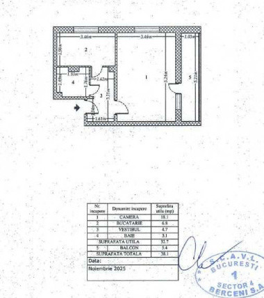 Alcatuit din: camere -1, bucatarie- 1, bai- 1, balcon- 1